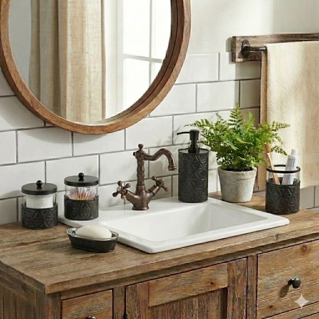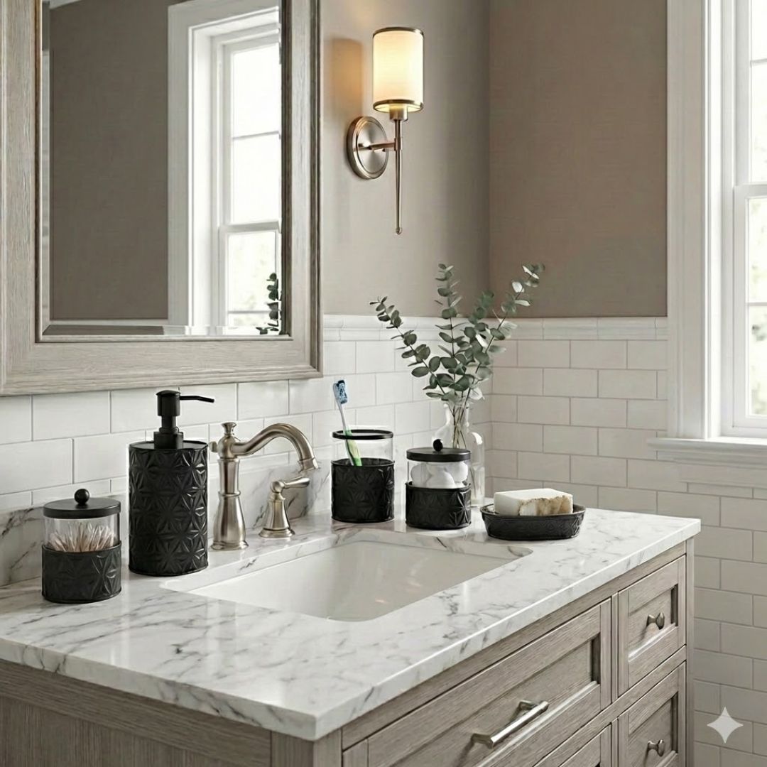 Don't forget about this awesome 5 Piece bathroom accessories set! The cool matte black finish of this five-piece set will add a fresh classic vibe to your bathroom. It includes a liquid soap dispenser, apothecary jars, a soap dish, and a toothbrush holder, all crafted of sturdy material designed to resist corrosion and humidity. With its eye-catching "circle of life" motif and high-quality glass and metal construction, your vanity shelf or sink counter will get an elegant upgrade while keeping you organized in style.