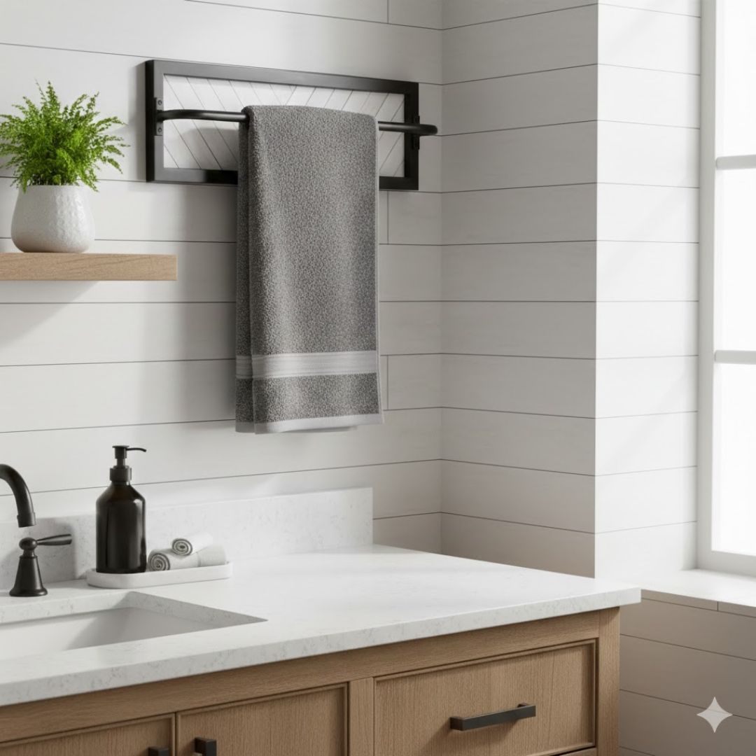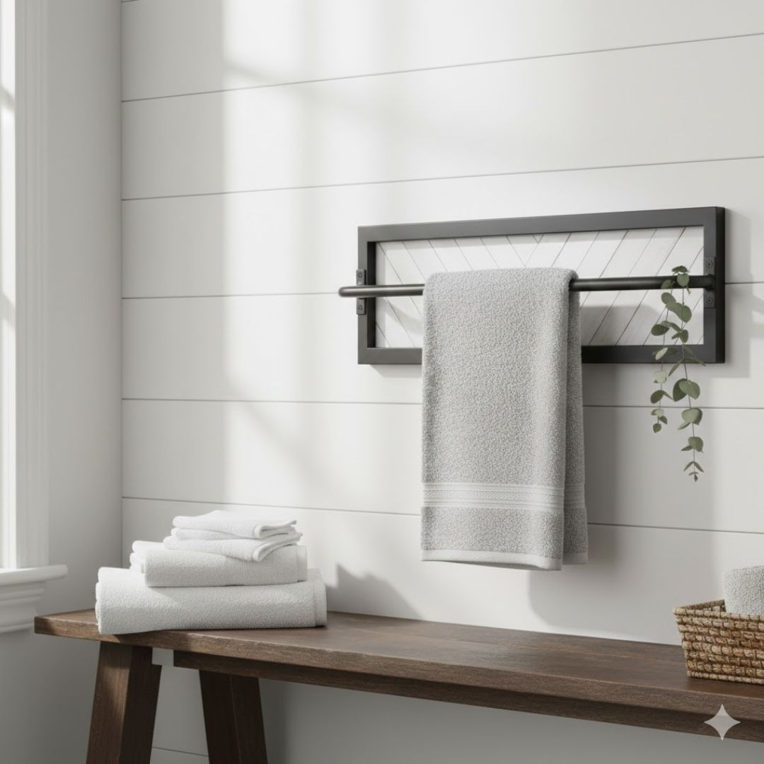 Combine style and function with Autumn Alley’s Shiplap Horizontal Herringbone Towel Rack. This charming piece doubles as a towel holder and farmhouse wall art, featuring hand-inlaid wooden planks that add rustic character and timeless texture. The sturdy metal hardware and strong frame ensure lasting durability, while the crisp white wood finish and dark retro frame bring a playful yet elegant touch to any room—modern or traditional. Includes herringbone backboard, black metal rod, and easy mounting hardware for hassle-free installation!