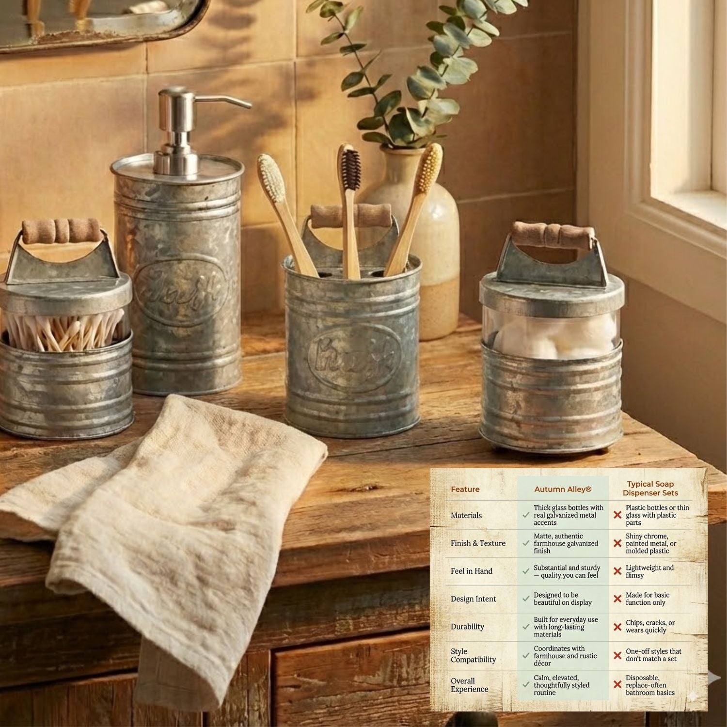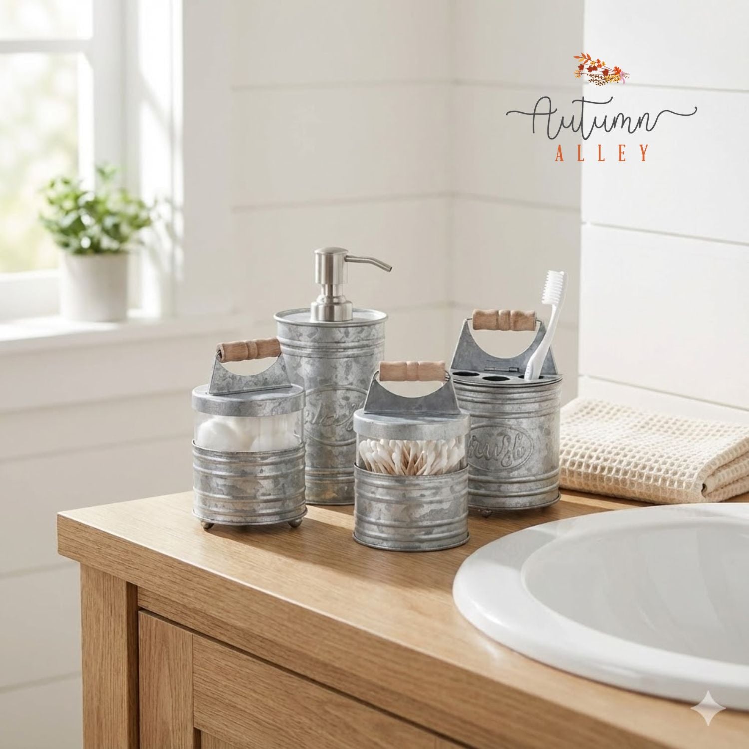 The beautiful galvanized finish on this unique four piece bathroom set will elevate your farmhouse bathroom with fun vintage charm. The liquid soap dispenser, apothecary jars, and toothbrush holder are made of sturdy and lightweight material impeccably coated against corrosion or humidity. The adorable wooden handles, little ball feet, and eye-catching "wash" and "brush" labels are small details that cover any vanity shelf/sink counter in rustic farmhouse touches while keeping organized.
