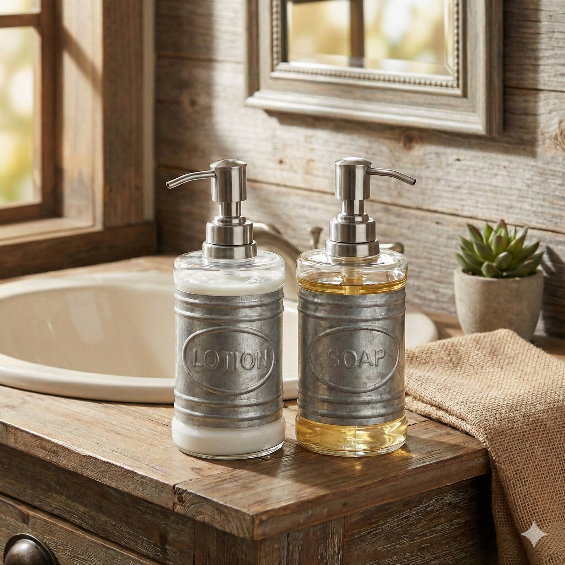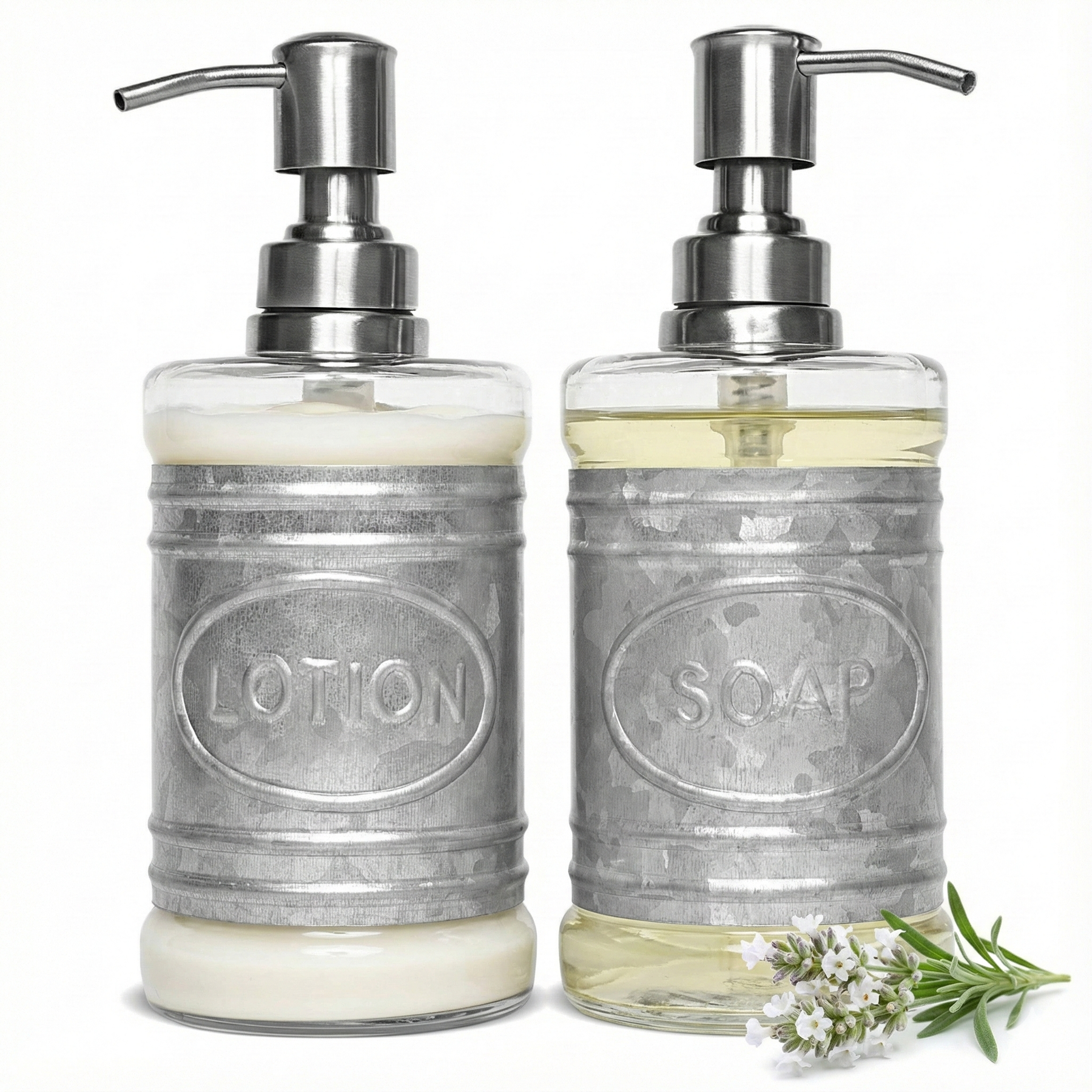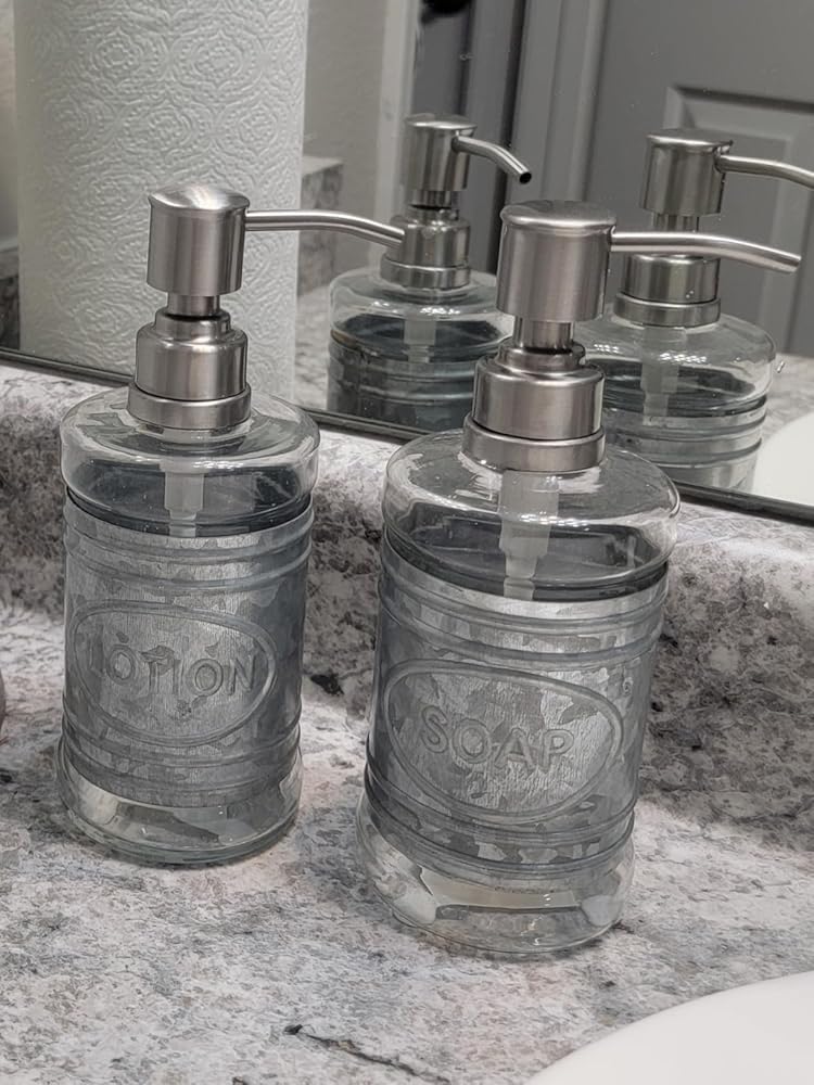 The soap and lotion dispenser set boasts a galvanized finish and beautiful glass that will add vintage charm to your farmhouse bathroom counter or vanity. It features a high-quality stainless steel pump that dispenses the perfect amount of soap, lotion, shampoo, or body wash every time. With a generous 16 oz. capacity, you will need to refill it less often. The delicate embossing and eye-catching 'SOAP' and 'LOTION' labels add a touch of elegance to these bathroom essentials while keeping your hands clean and fresh.