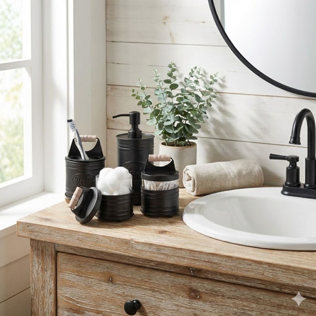 Autumn Alley 4 Piece Black Bathroom Set with Soap Dispenser, Toothbrush Holder & 2 Apothecary Jars on Bathroom Sink with round mirror and sink