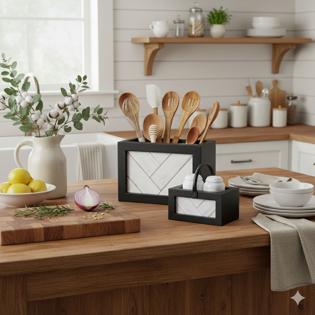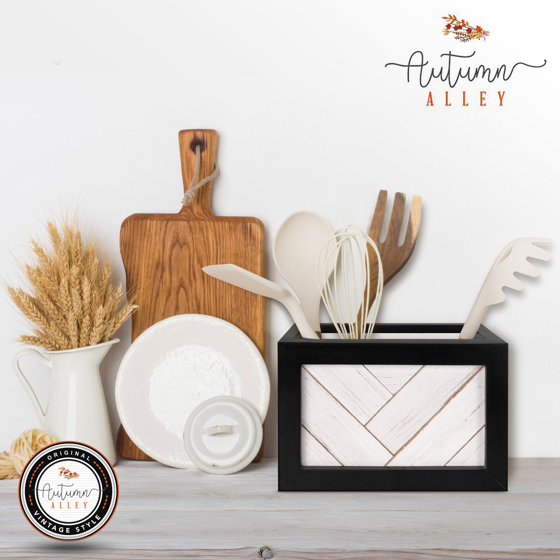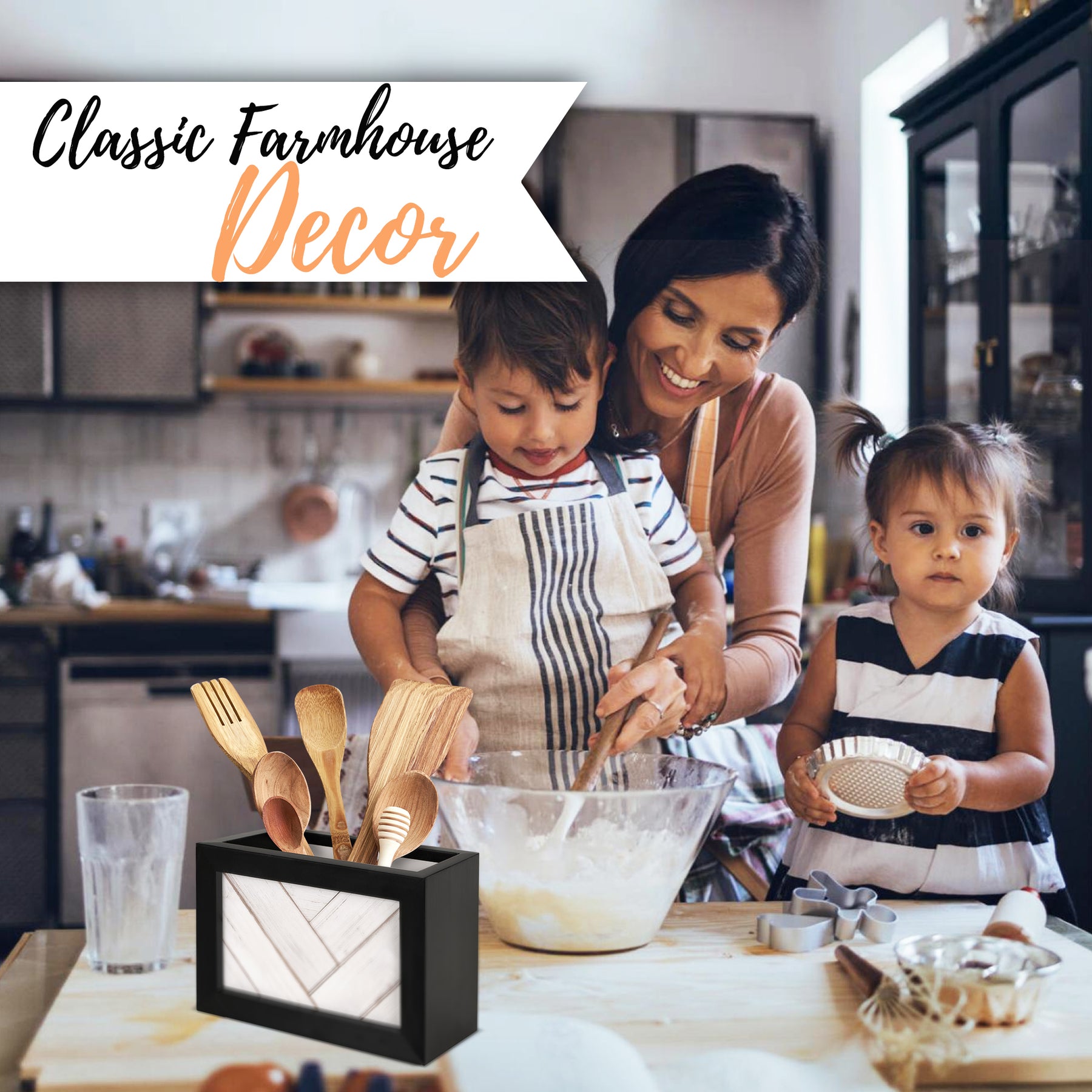 The 2-piece rustic farmhouse decor from Autumn Alley is designed with practicality in mind; Our adorable salt and pepper shakers caddy and utensil holder set doubles as farmhouse kitchen decor while easily holding all the seasoning or utensils you need. The hand-inlaid wooden planks on both pieces add country character, texture and timeless elegance. Each modern farmhouse salt and pepper shakers with holder has unique, sturdy metal handle strong structure, and a sublime white wood finish that oozes pure state-of-the-art craftsmanship. The dark retro frame & white inlaid planks elevate any contemporary/traditional home.