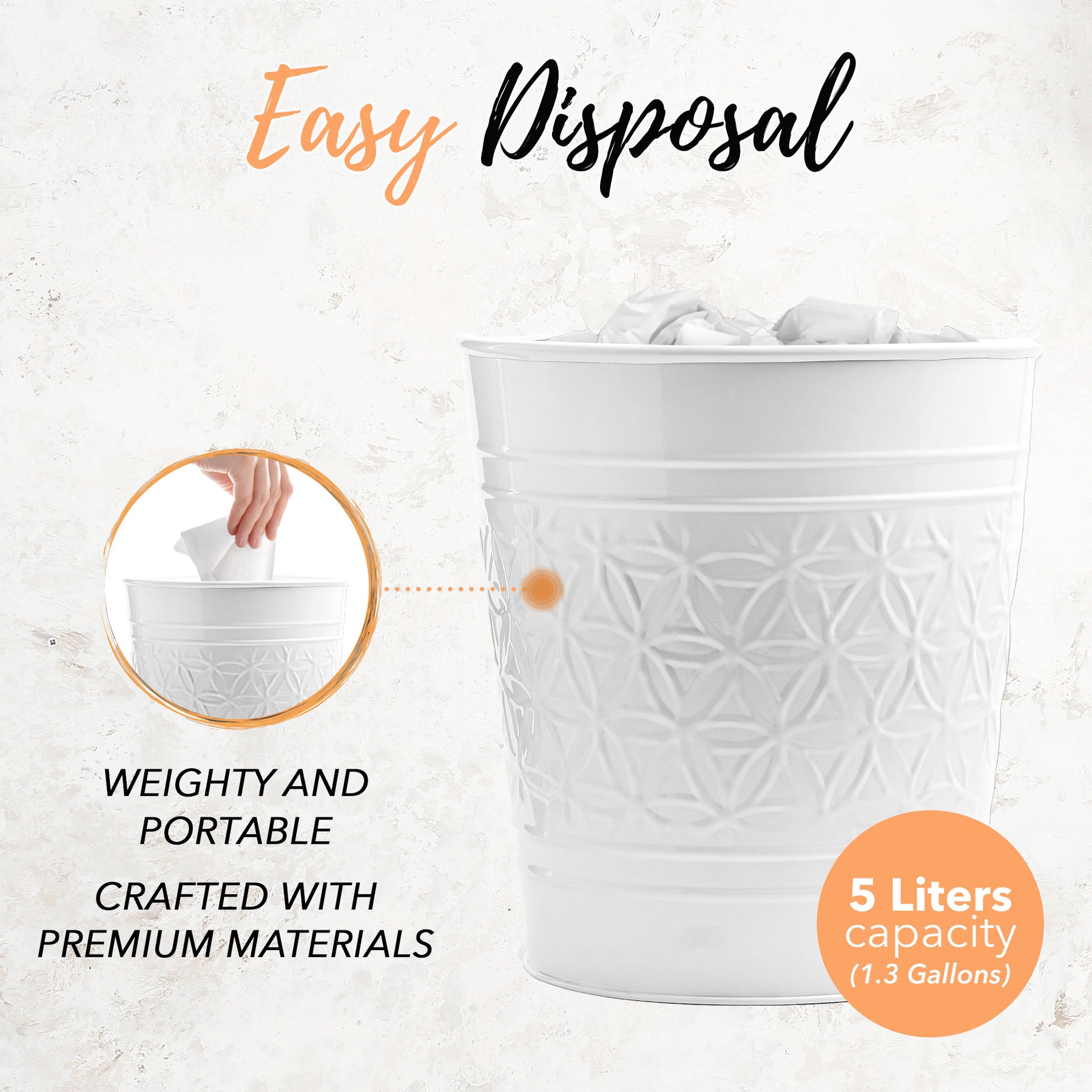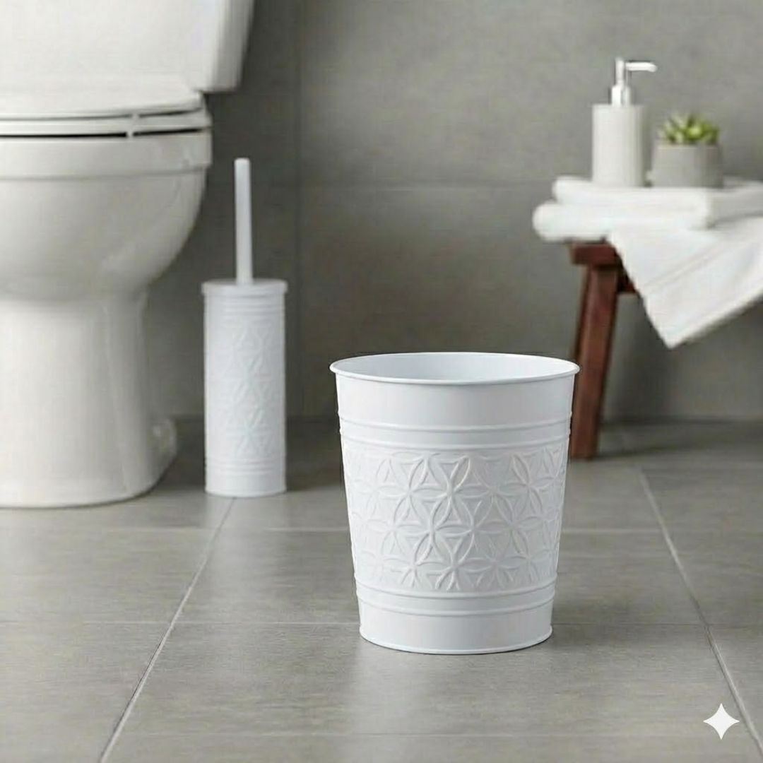 This glossy white hand-crafted trash can brings a playful classic vibe to your bathroom or office. Featuring a charming floral pattern, this open bin holds a roomy 7L (2Gal). Its geometric embossed design and durable metal build add a pretty, modern edge while staying easy to clean. Plus, it pairs perfectly with the rest of the Jamie Collection, making tidying up a bit more fun!