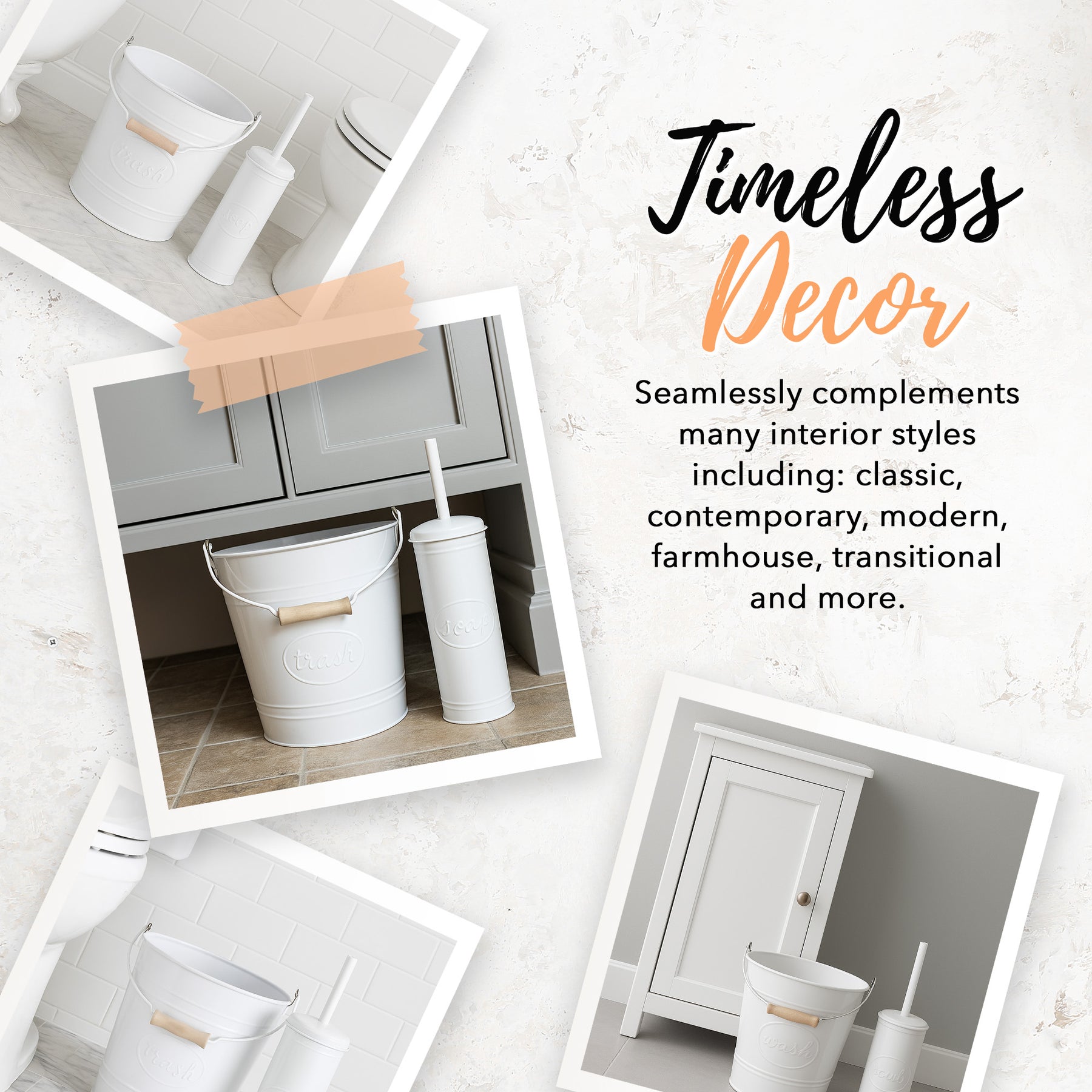 • Charming Rustic Design – The white bathroom trash can features a wooden handle, embossed ring design, and “Trash” script, while the toilet brush white holder matches seamlessly for a cohesive white bathroom accessories set