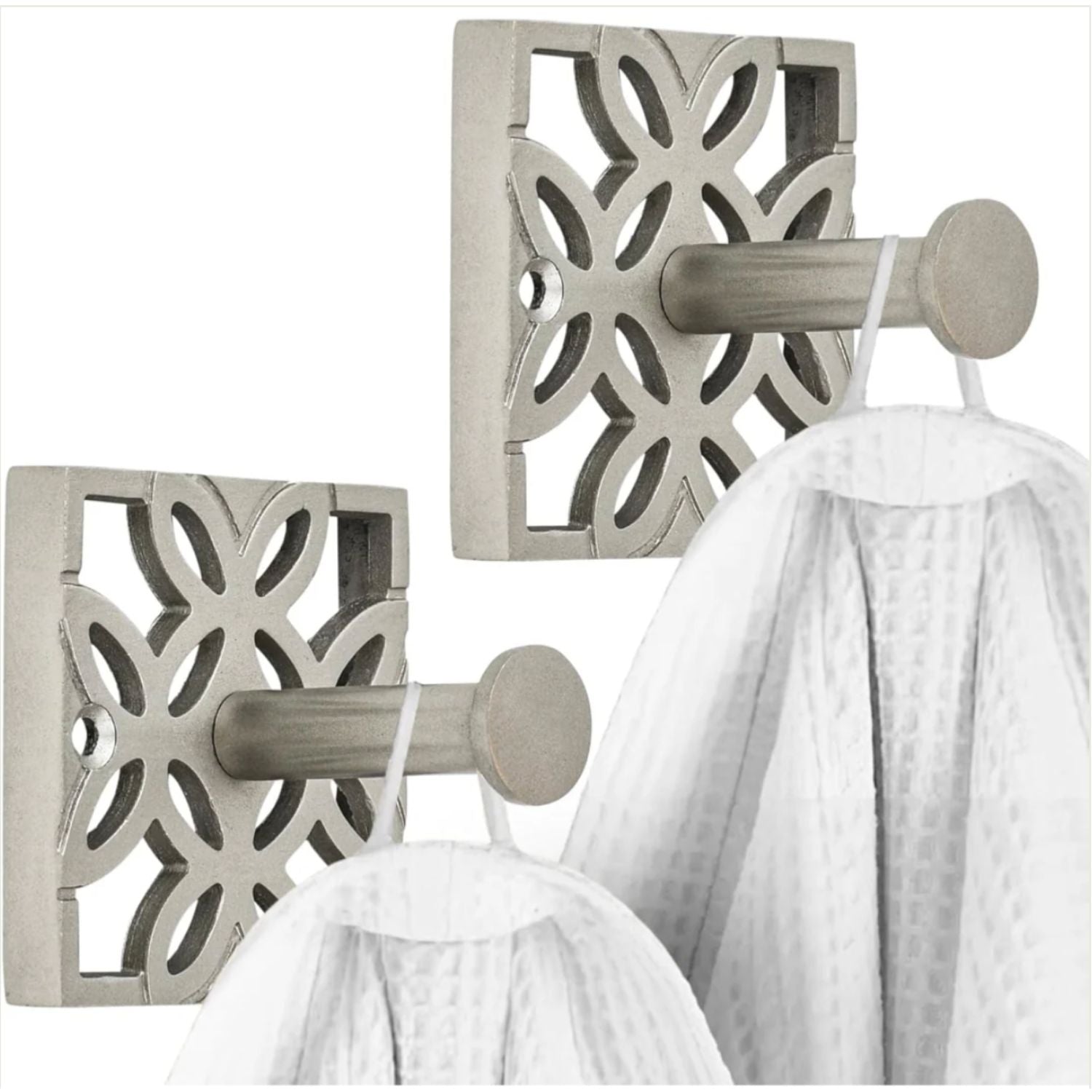 The Jamie Line Bathroom Robe Hook Set is comprised of 2 timeless pieces. The floral geometric design is absolutely classic and made of matte black powder-coated cast aluminum. The wall hooks have a touch of industrial style and a lip at the end of the rod to keep towels, clothes, or coats in place. The two robe hooks are sturdy and easy to hang with the included hardware. Hang the hooks together or apart while mixing and matching with the rest of the Jamie Collection!
