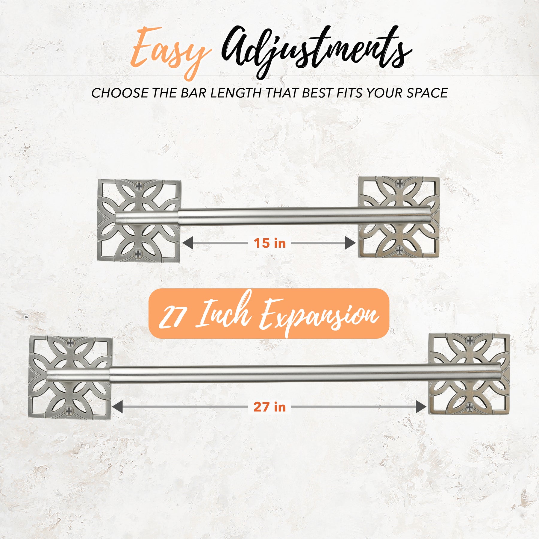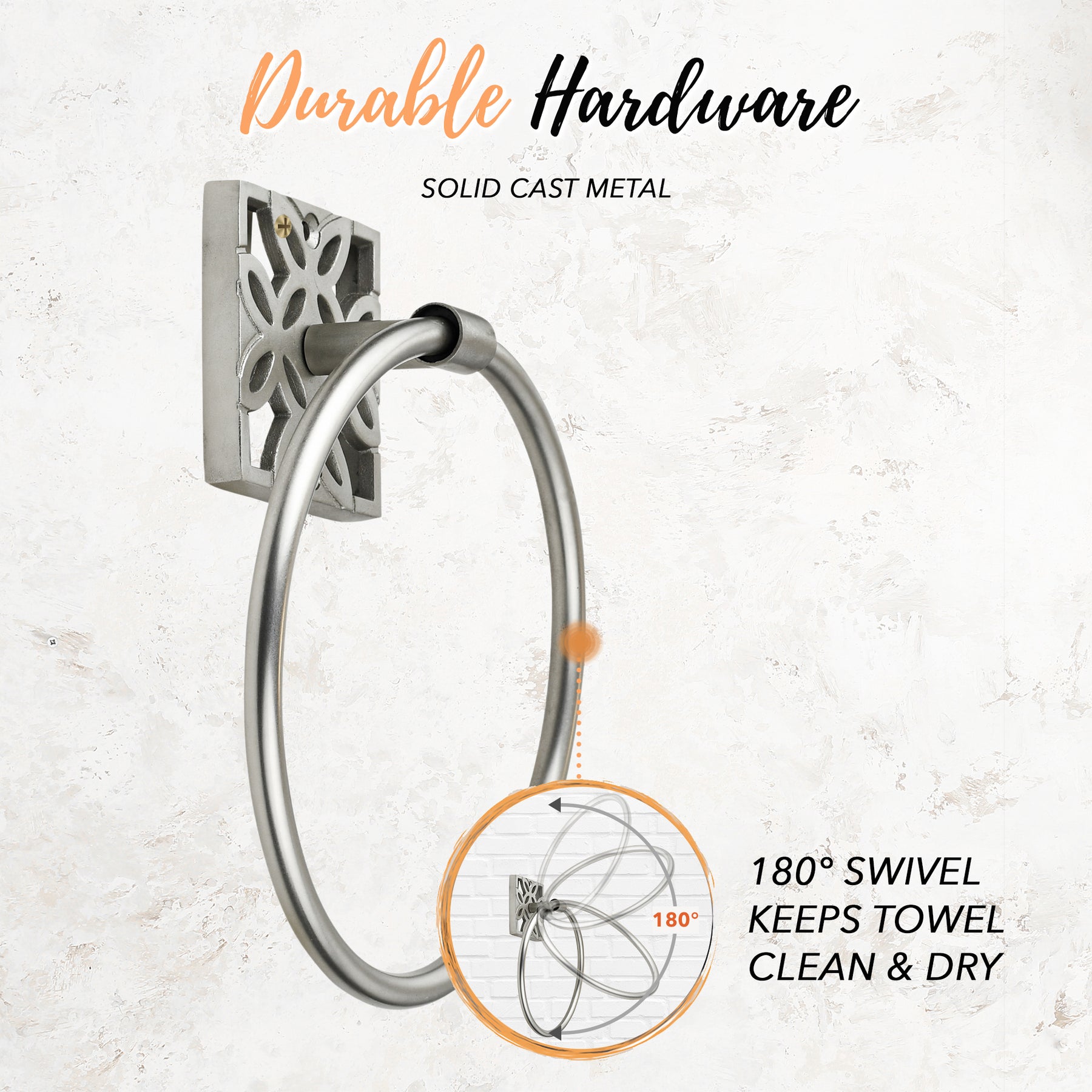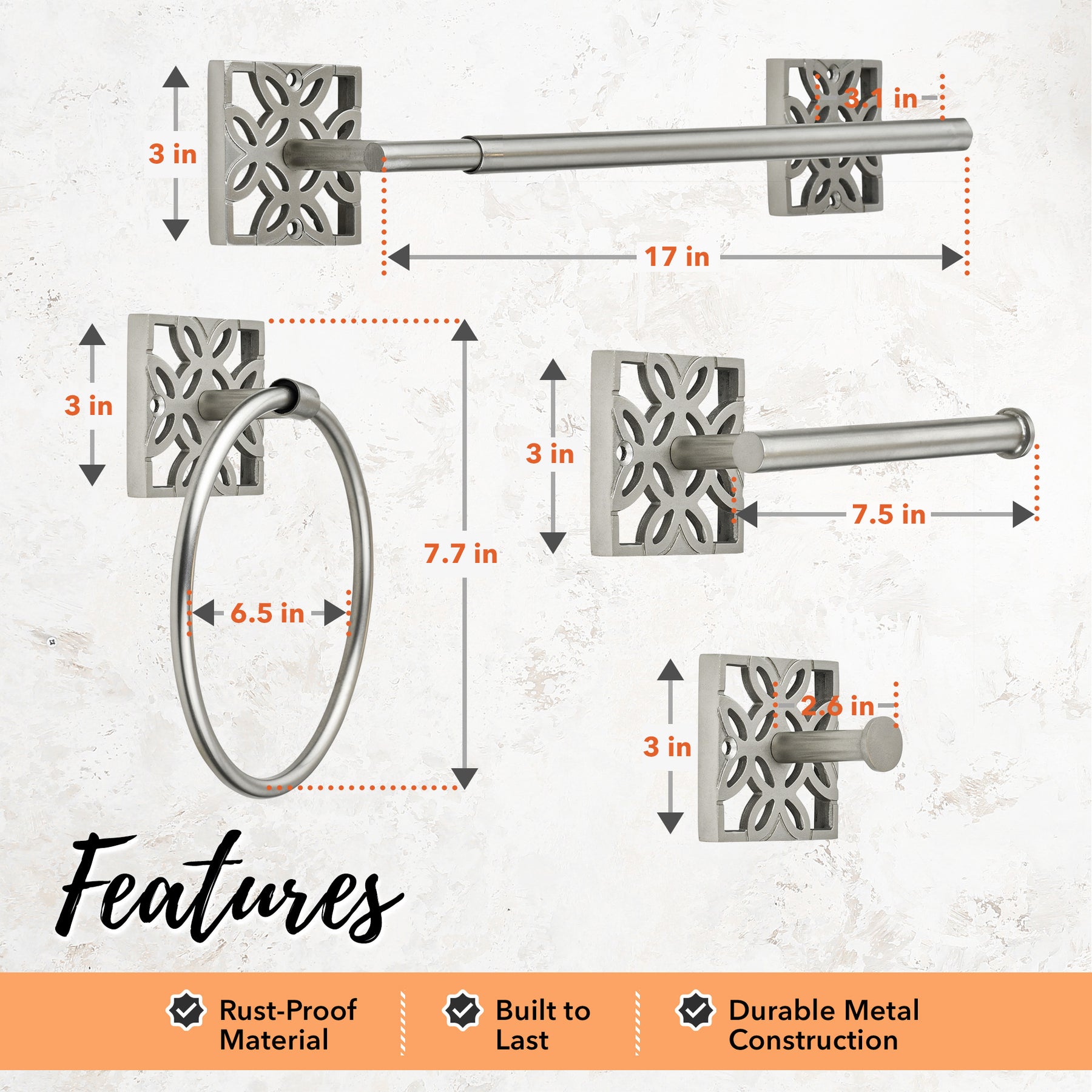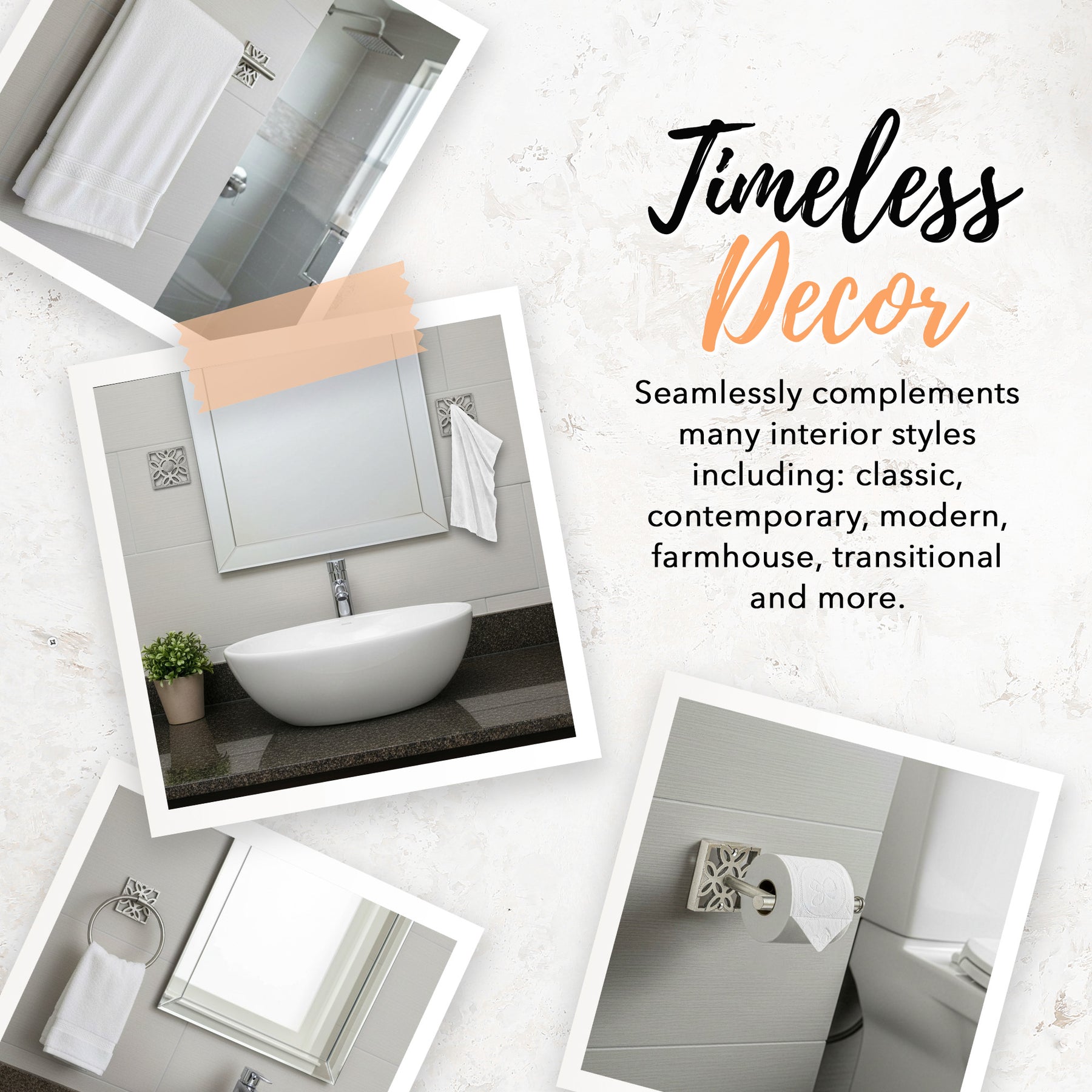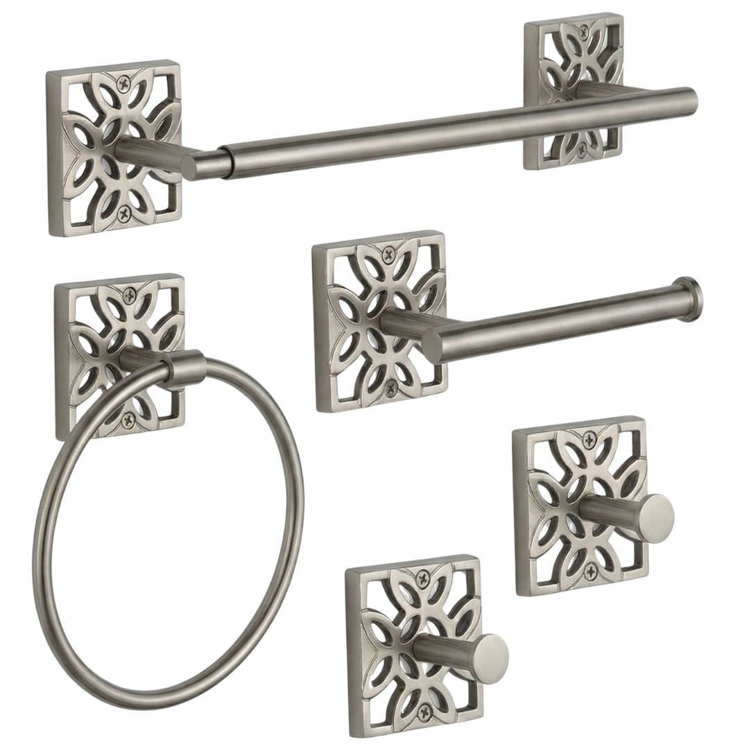 This five-piece bathroom set brings a unique mix of classic, yet modern flair to your daily routine. Each piece features a brushed nickel finish with subtle geometric detailing that works beautifully in any space. The rotating 6" towel ring keeps essentials within arm's reach, while the adjustable towel rack stretches from 15" to 27" to fit your layout perfectly. A sturdy toilet paper holder with a safety lip prevents mid-roll mishaps, and two robe hooks round out the collection. Mix and match with other Jamie Collection pieces to create your ideal bathroom hardware ensemble—or keep it cohesive for a polished, coordinated look.