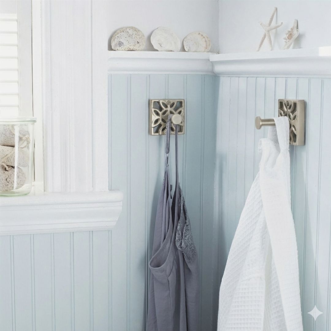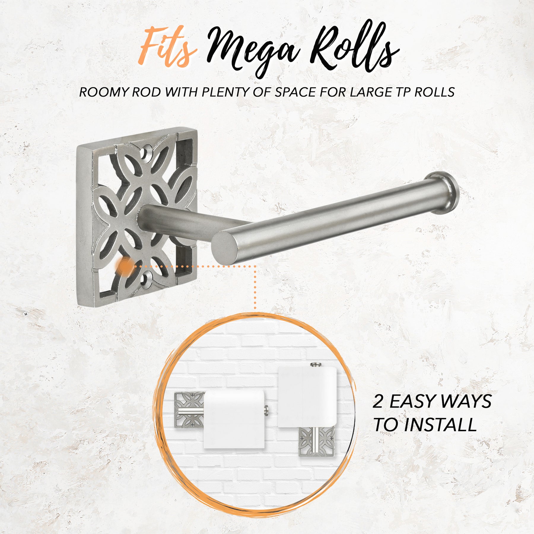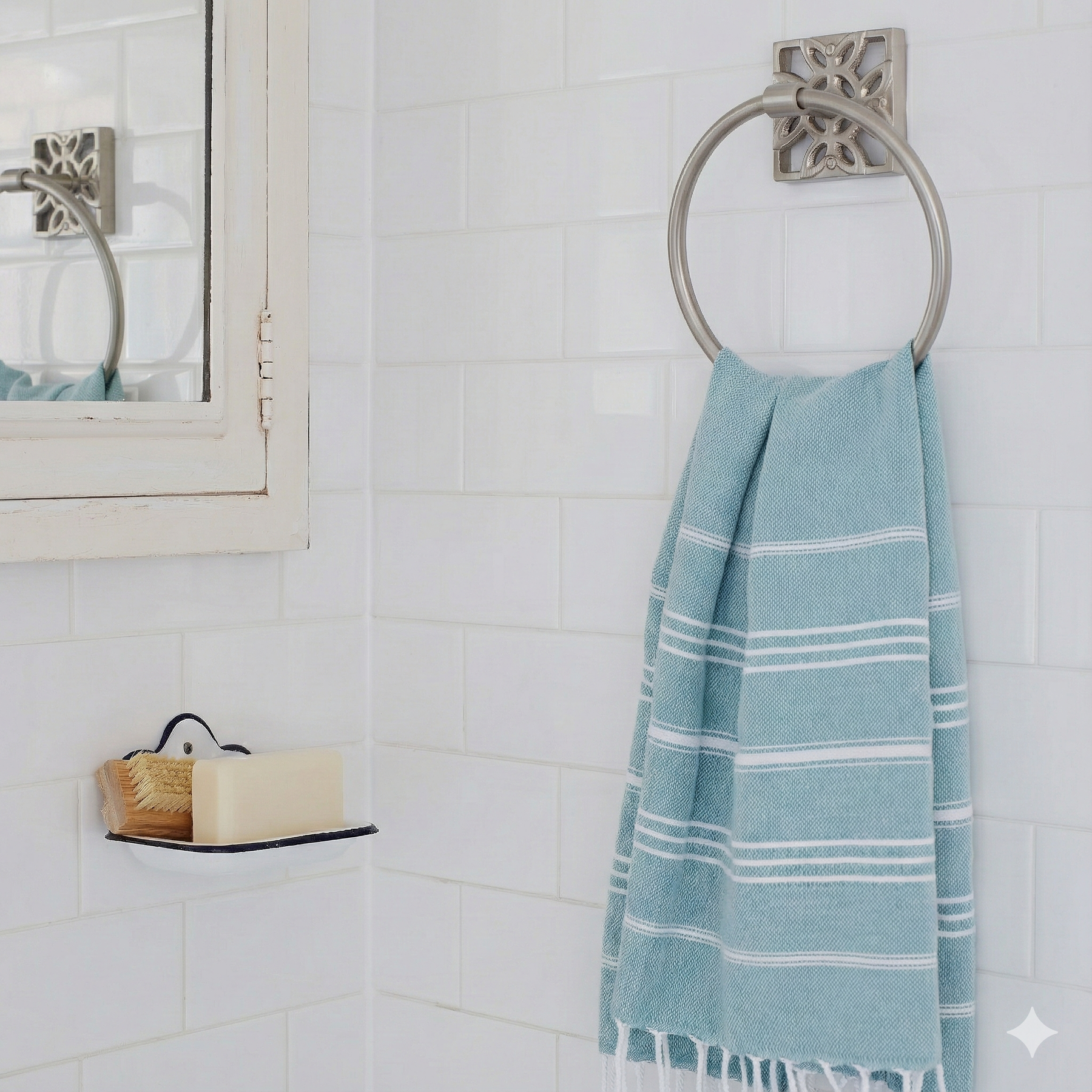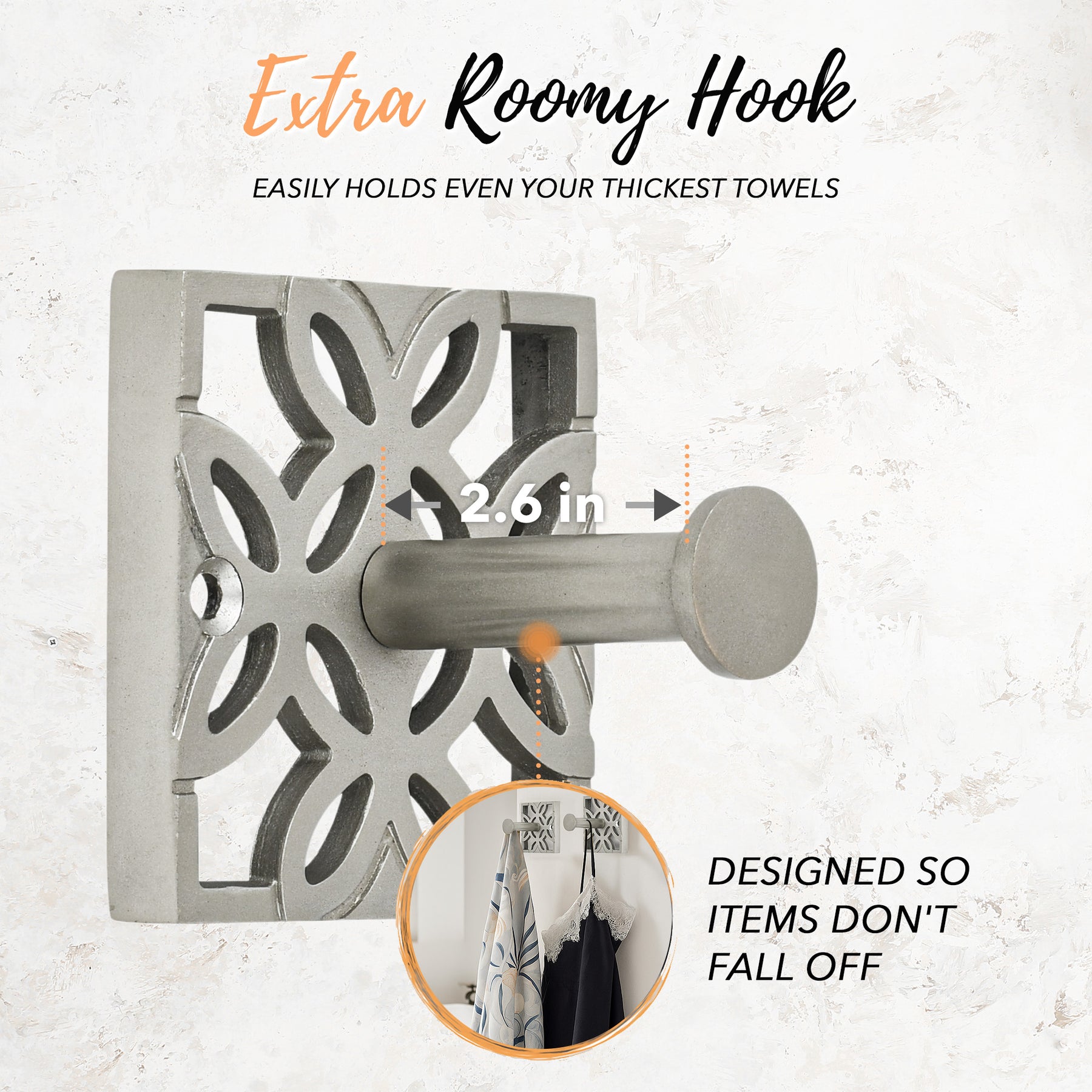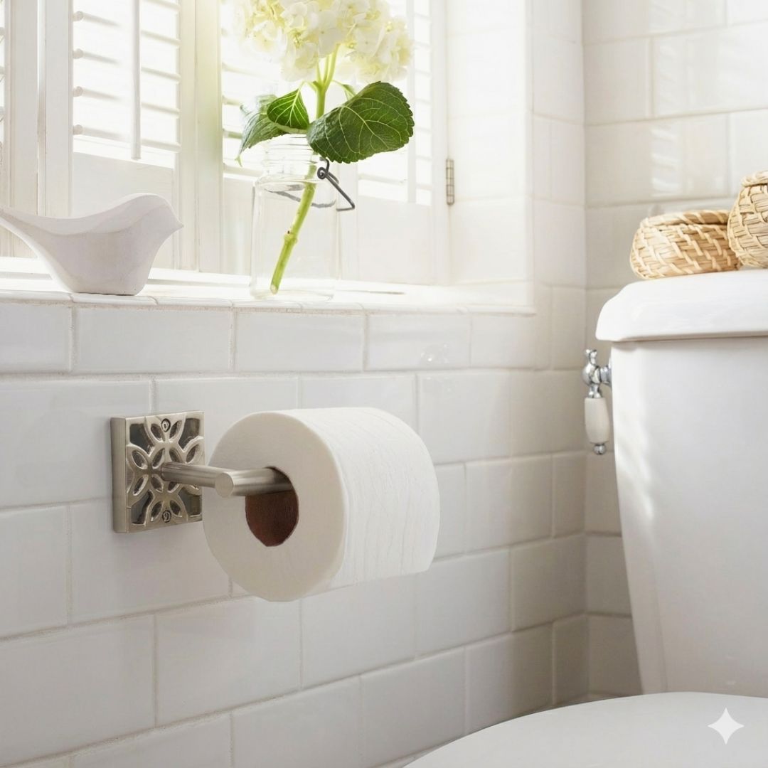 This five-piece bathroom set brings a unique mix of classic, yet modern flair to your daily routine. Each piece features a brushed nickel finish with subtle geometric detailing that works beautifully in any space. The rotating 6" towel ring keeps essentials within arm's reach, while the adjustable towel rack stretches from 15" to 27" to fit your layout perfectly. A sturdy toilet paper holder with a safety lip prevents mid-roll mishaps, and two robe hooks round out the collection. Mix and match with other Jamie Collection pieces to create your ideal bathroom hardware ensemble—or keep it cohesive for a polished, coordinated look.