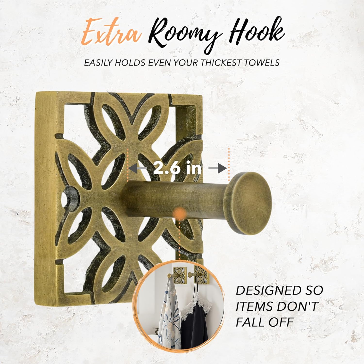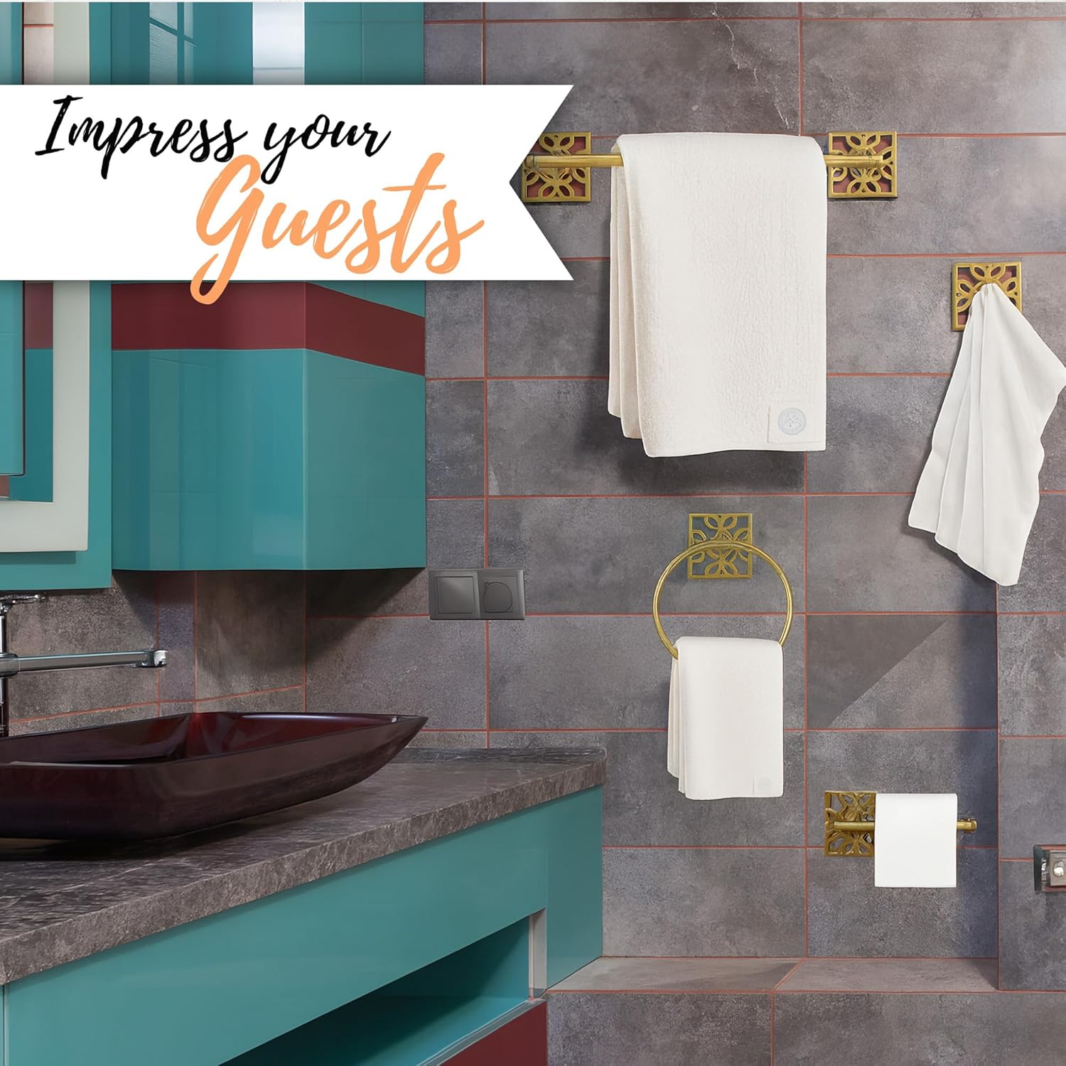 - Complete & Coordinated Bathroom Set: Upgrade your space with this complete 5-piece set featuring a sturdy bathroom towel holder, matching towel bar set, brass towel ring, brass toilet paper holder, and two brass hooks. Designed to deliver a cohesive and elegant bathroom upgrade